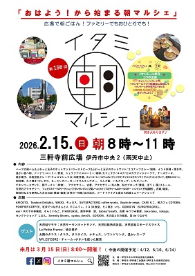月1回の日曜日、三軒寺前広場で「おはよう!から始まる朝マルシェ」を合言葉に朝食などを楽しむ催しです。朝食だけでなく、かわいい雑貨の販売やミュージシャンによる生演奏もあるイタミ朝マルシェにぜひお越しください。