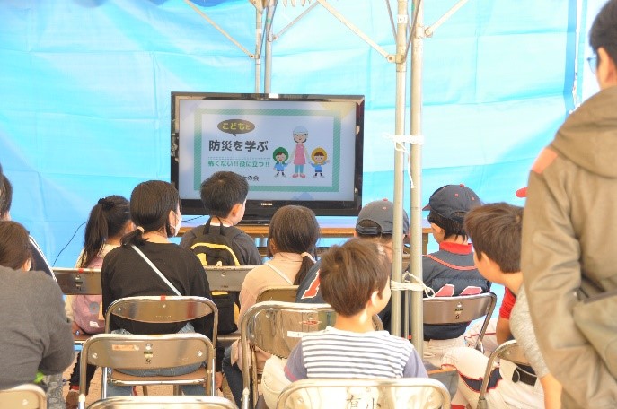 地震体験車ブースでは南海トラフ地震を模擬した揺れを体感していただきました。震度7相当の大きな揺れは体勢を保つことができないほどで、年配の方は恐る恐る、子どもは何度も乗車するなど、アトラクション的な感覚で人気の高いブースとなりました。親子一緒に体験される方も多く、お父さんが子どもを守る仕草が見られるなど感動的なシーンや、東消防署の方も乗車されるなど、とても貴重な体験であることが分かりました。