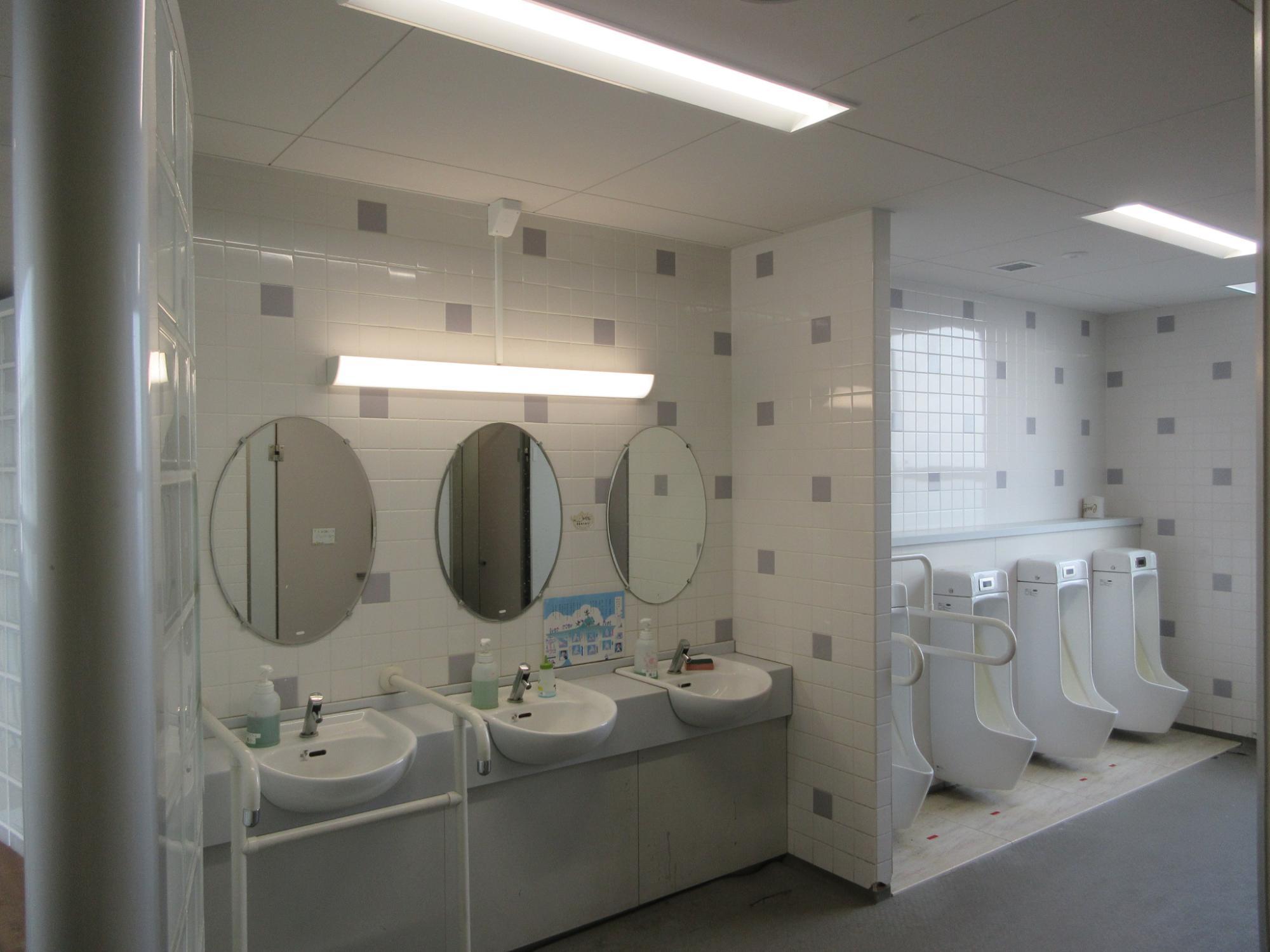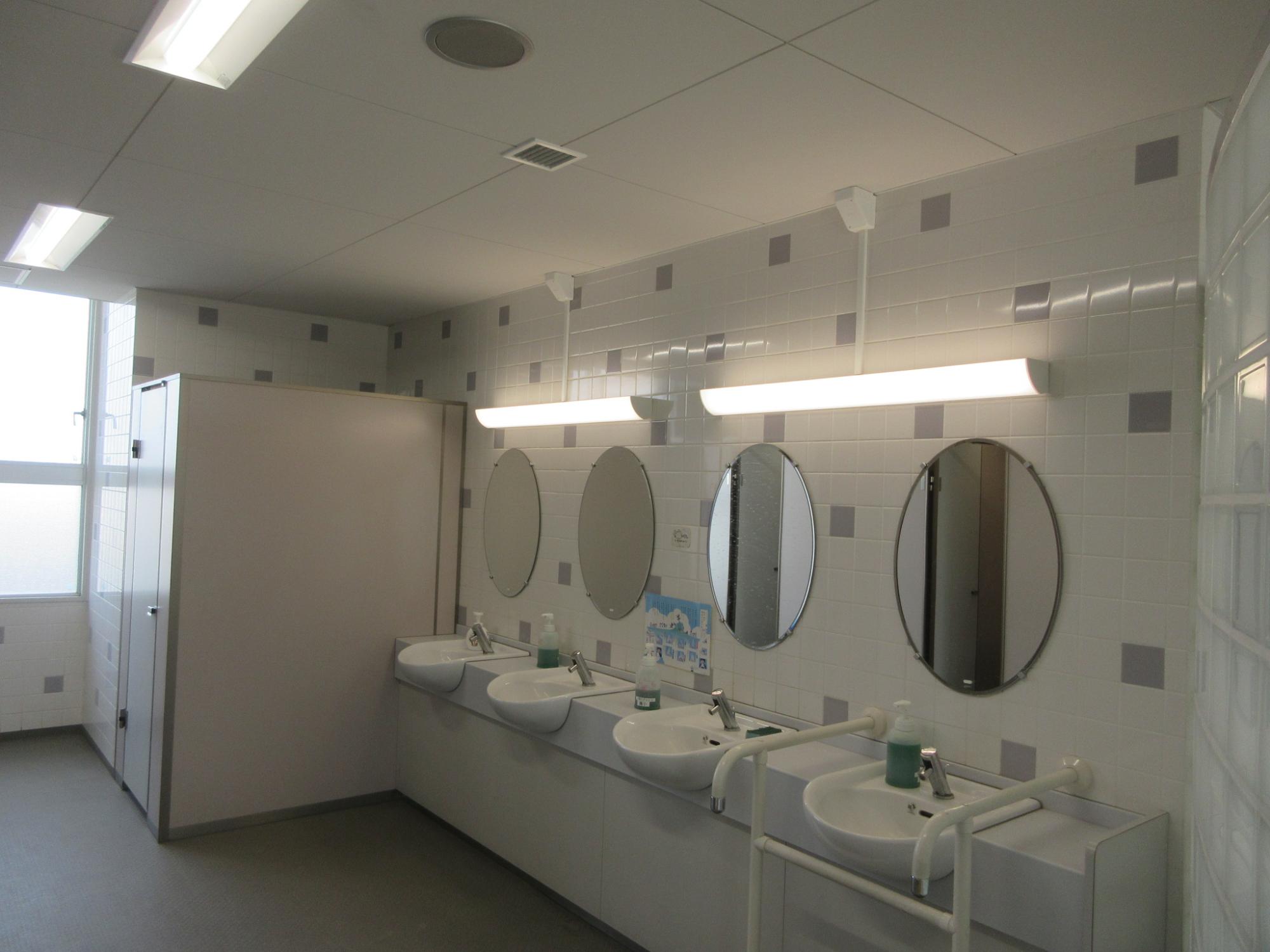 南校舎棟の1~3Fトイレおよびプール付属棟トイレ照明設備をLED化しました。合わせて人感センサーによる照明、換気設備の自動入切も実施しました。(令和7年8月完成)