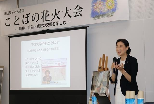 また、田辺聖子文学館副館長の中周子さんより、「田辺さんの愛した短歌と俳句と川柳と」と題してお話し頂きました。