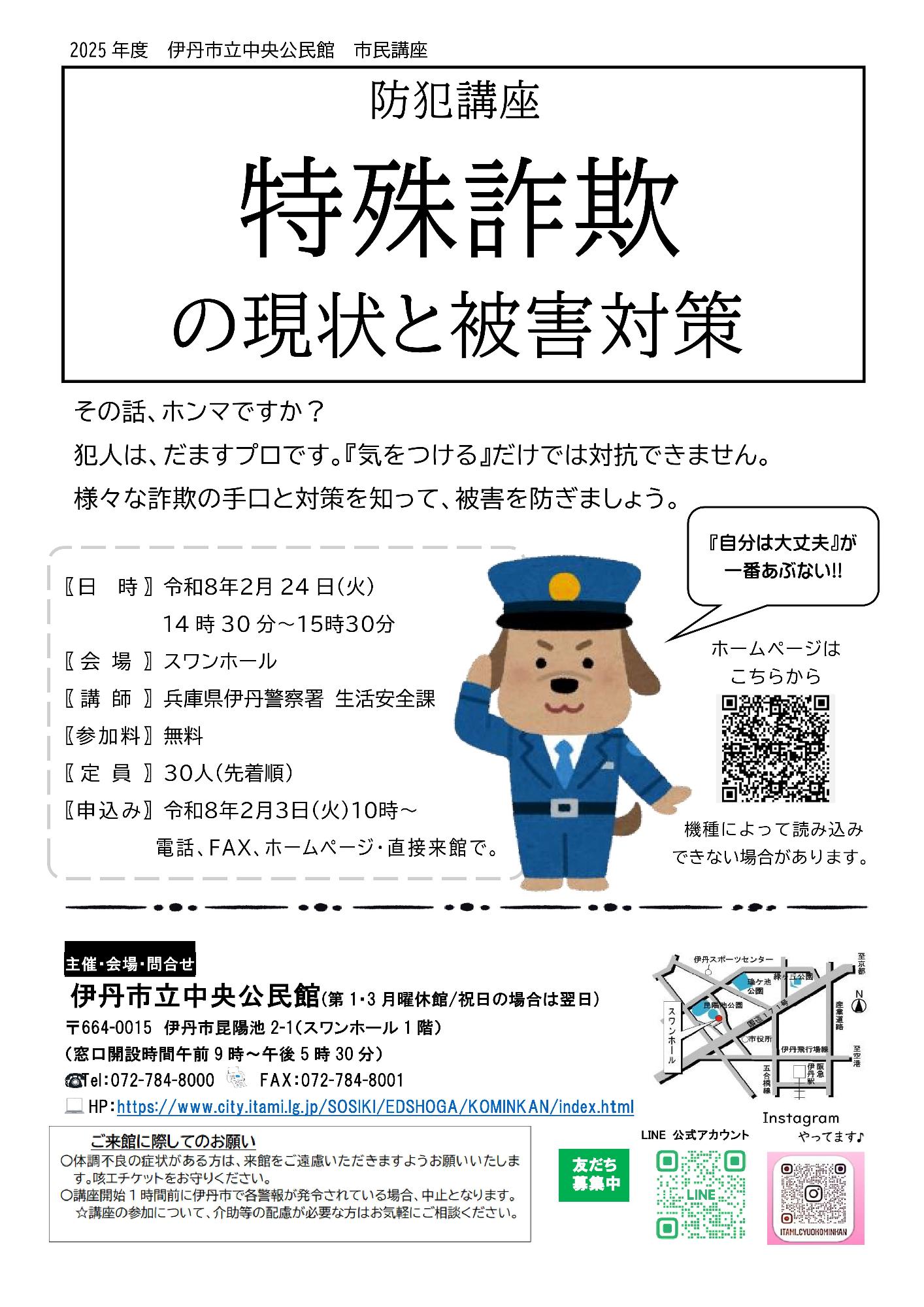 講座開始1時間前に伊丹市に各種気象警報が発令されている場合は、中止となります。また、そのほかの都合により、急遽中止となる場合があります。