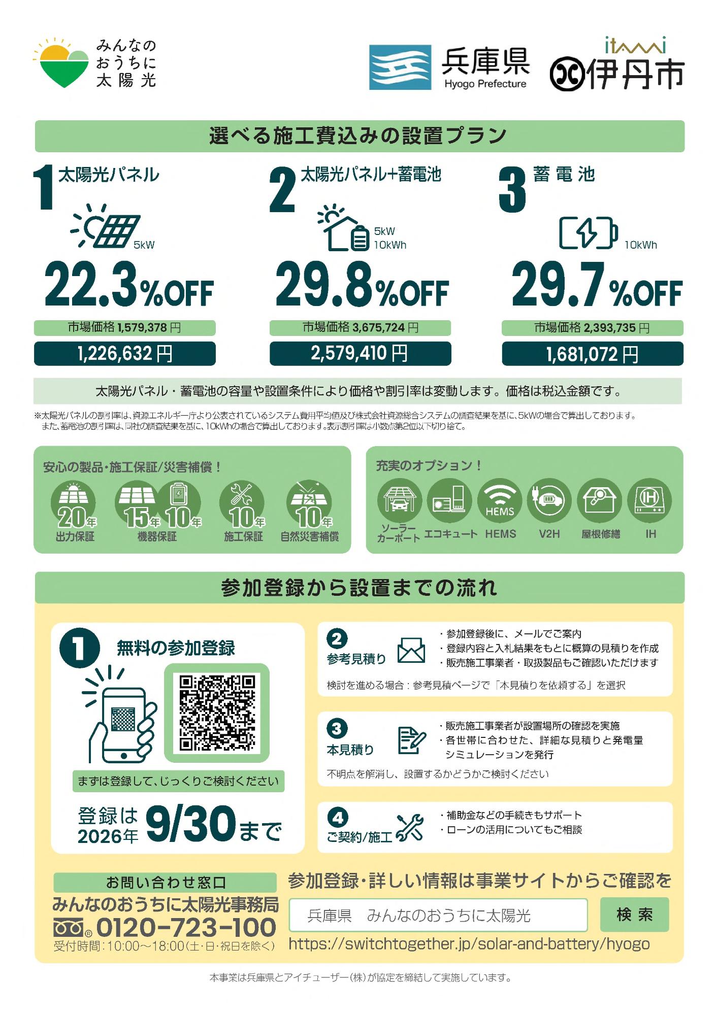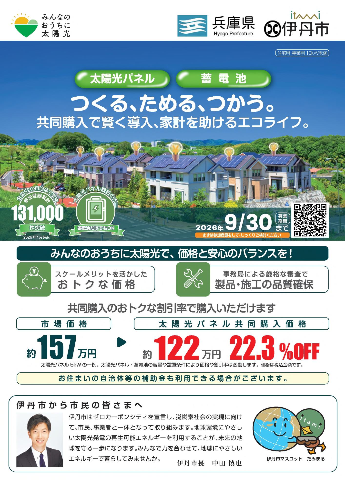 再生可能エネルギーの普及や、省エネルギーの推進を目的に、伊丹市内の戸建て住宅や事業所等を対象にした、太陽光発電及び蓄電池設備の普及促進を図る、「住宅用太陽光発電設備等の共同購入支援事業」を実施します。