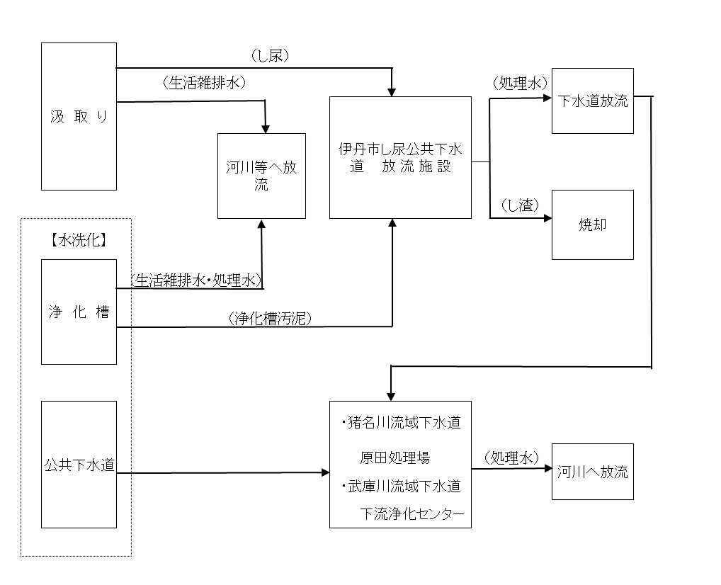 公共下水道への放流以外のし尿の発生としては、浄化槽、くみ取り式便所、仮設トイレがあり、それらはし尿収集業者により回収され伊丹市し尿公共下水道放流施設にて処理しています。