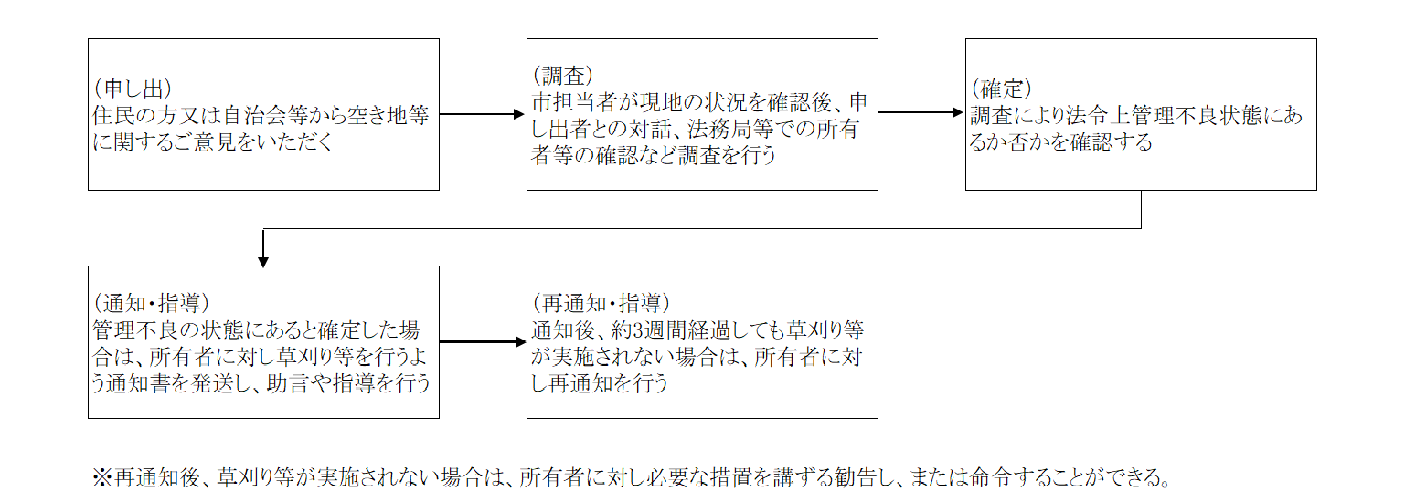 市民の方から、空き地に関する相談(敷地内の草木の繁茂・不快害虫の発生・不法投棄)を受けた場合、伊丹市環境保全条例に基づいて、空き地の所有者に対し適正管理について指導等を行っております。