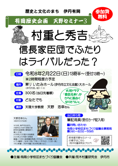 【有岡小学校区まちづくり協議会】2月22日 「有岡歴史企画 天野セミナー3 村重と秀吉」を開催します