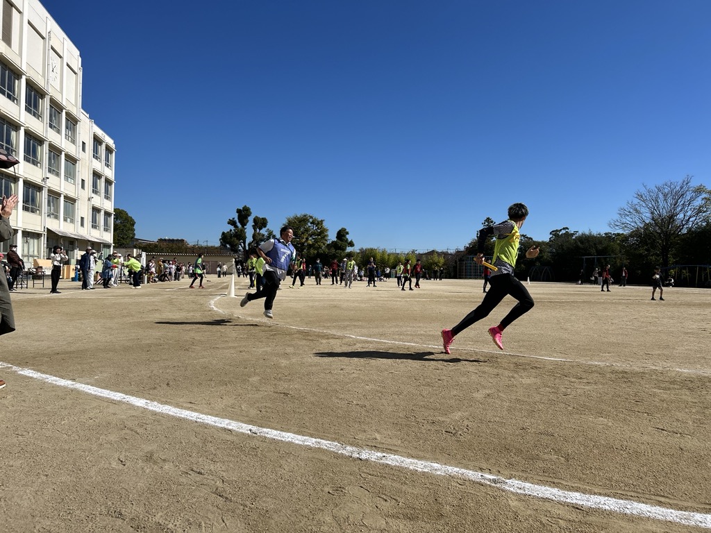 そして最後には健脚自慢の保護者と先生方がチームを組み、大人の本気リレー。子どもたちの応援を受けて、アンカーの校長先生も「本気」で頑張っておられました!