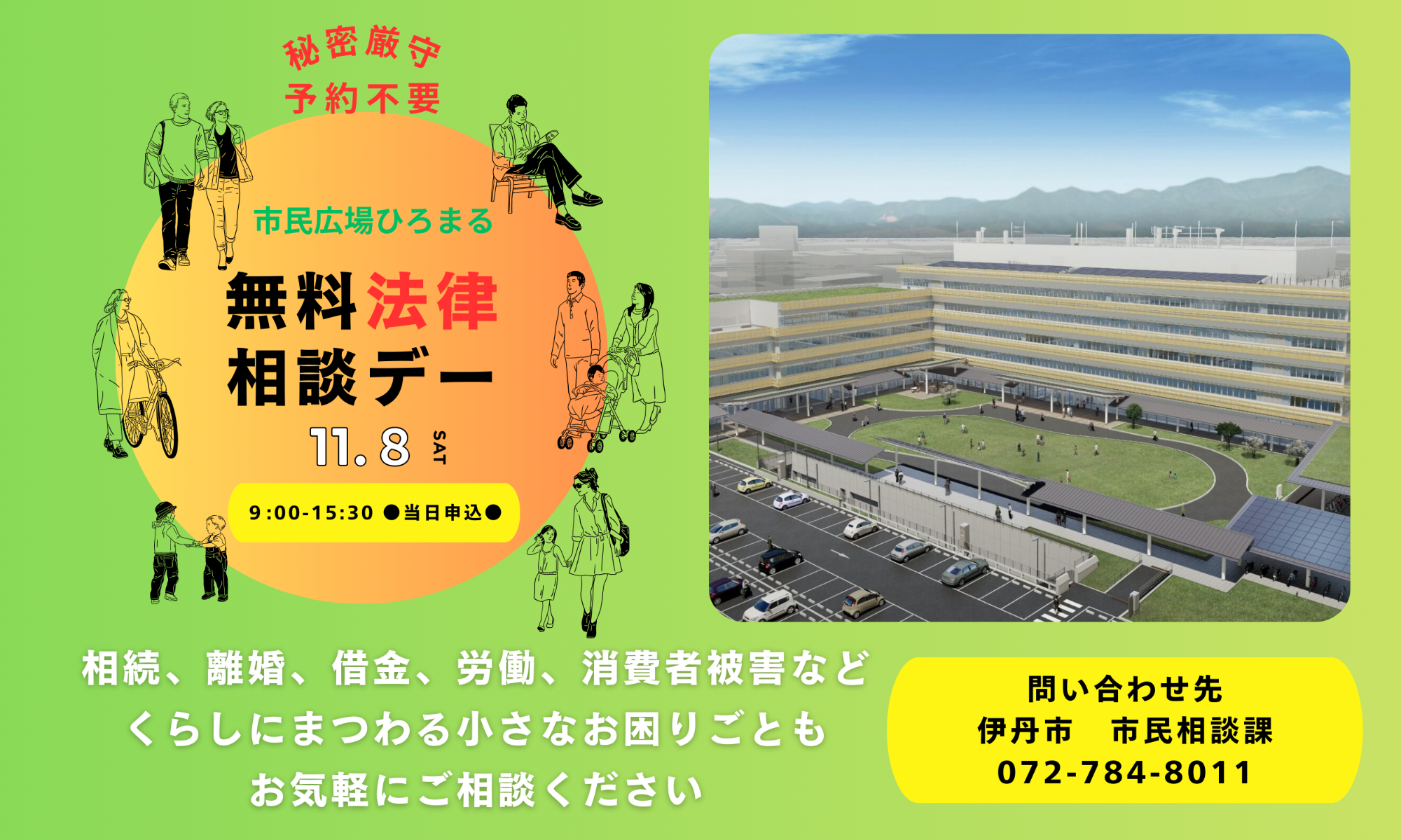 伊丹市役所新庁舎の市民広場「ひろまる」で、弁護士による無料法律相談を初めて開催します。予約不要・当日受付のみで、相続や消費者トラブル、交通事故など暮らしに関わる法律全般に気軽にご相談いただけます。農業祭と同時開催で、啓発物品の配布も予定。深まる秋の広場で、市民が司法を身近に感じ、弁護士と気軽にふれあえる貴重な機会です。