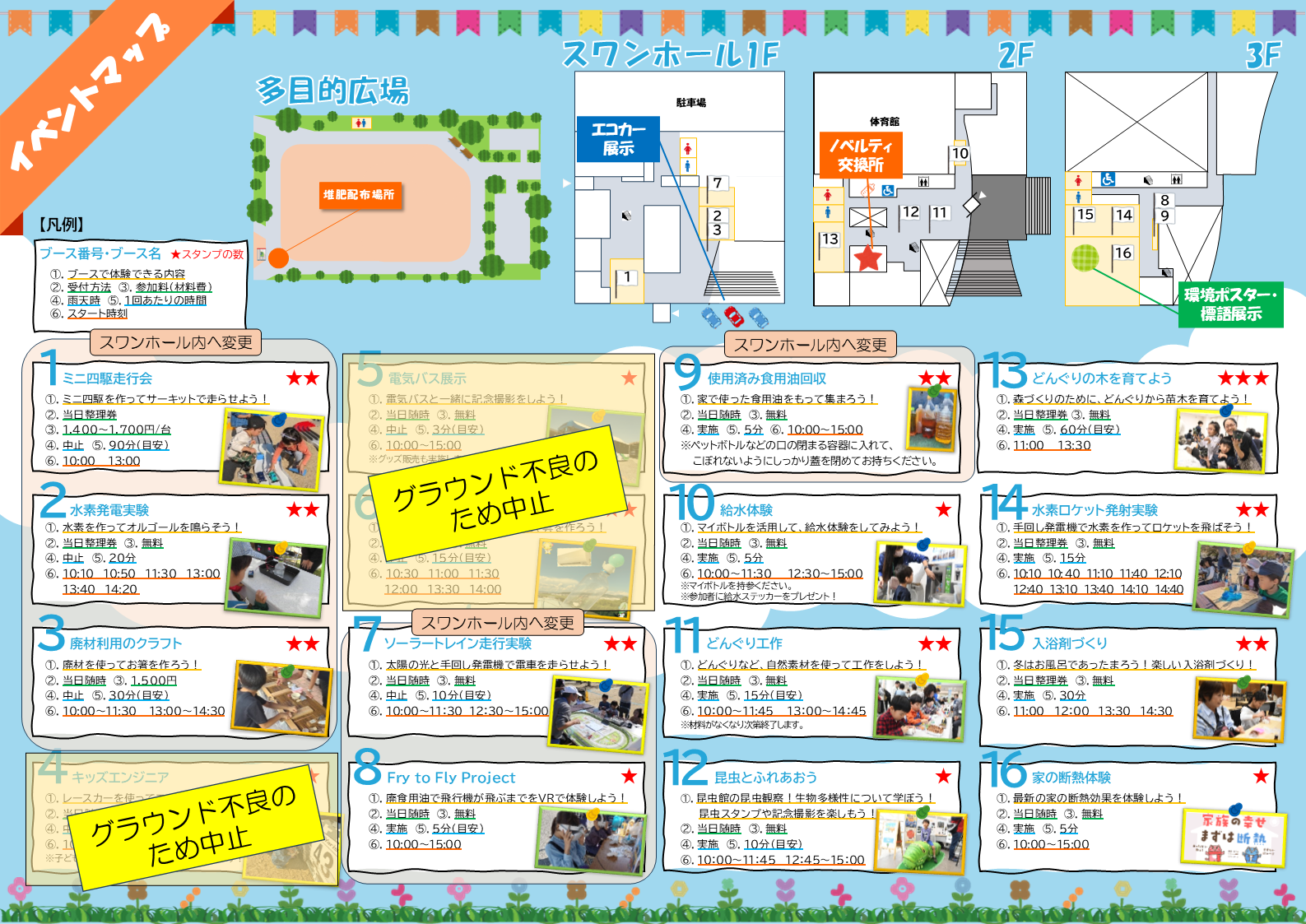 なお、屋外で予定しておりました「ミニ四駆走行会」「水素発電実験」「廃材利用のクラフト」「ソーラートレイン走行実験」「Fry to Fly Project」「使用済み食用油回収」のブースは、スワンホールにて実施します。