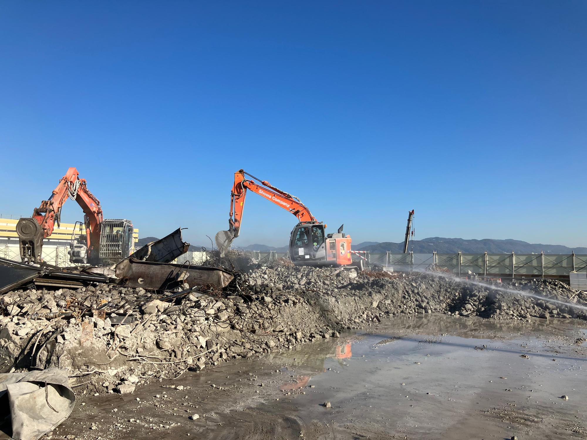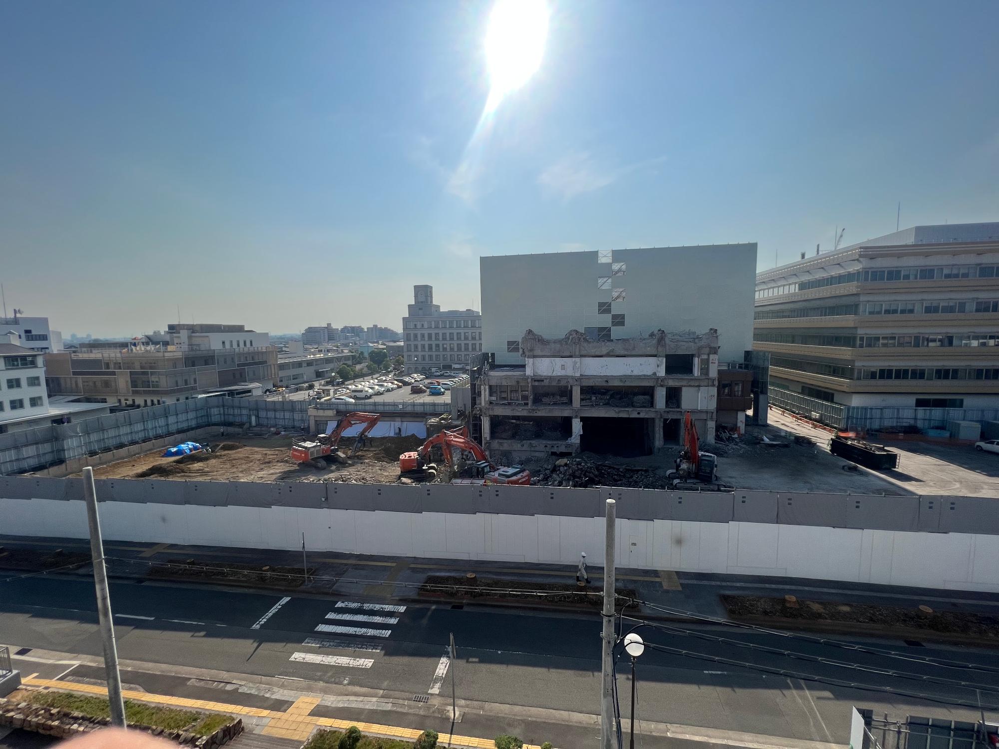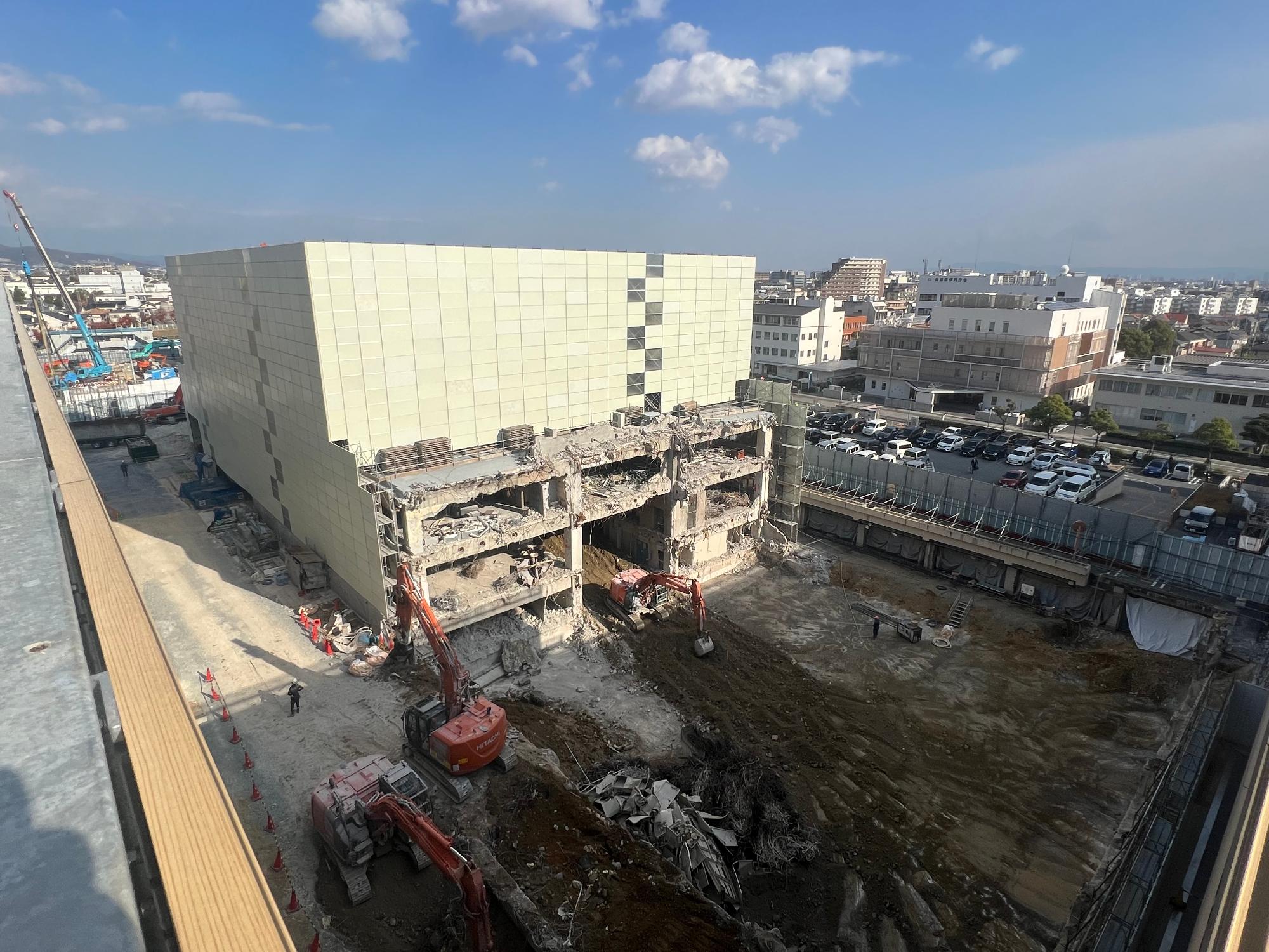 旧医師会エリアについて上屋の解体が完了しており、今後、建物を支えていた地中杭の撤去を行います。西側エリアの解体では、内部躯体の解体が完了したため外壁の解体へと進めています。