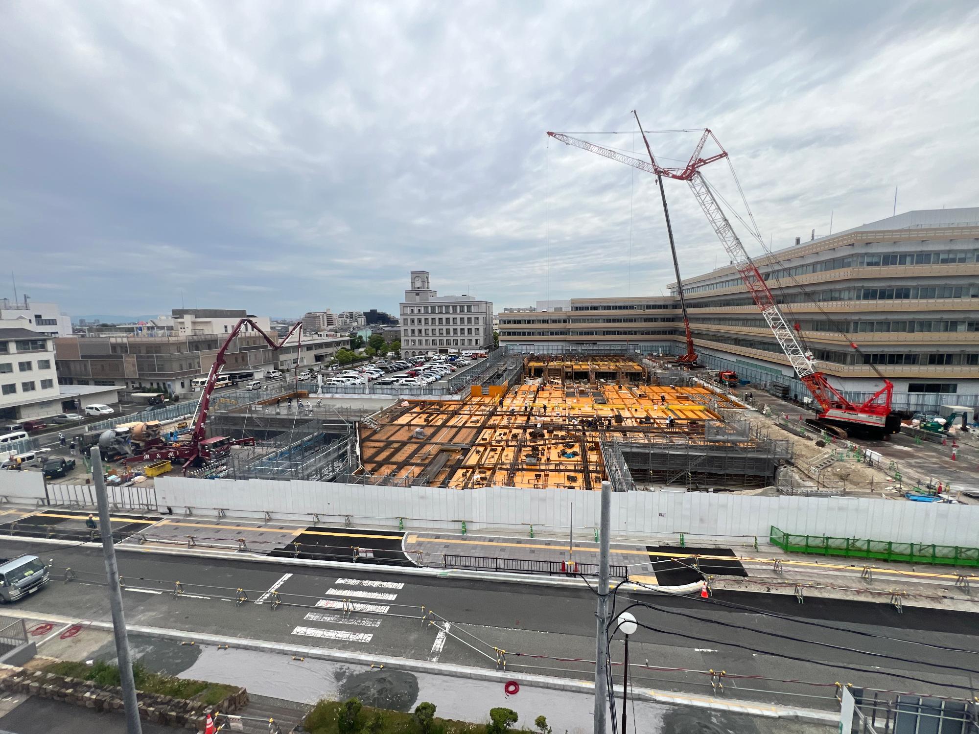 旧医師会エリアでは地中杭の撤去を行っています。旧庁舎高層棟の屋上では、躯体の解体を進めています。